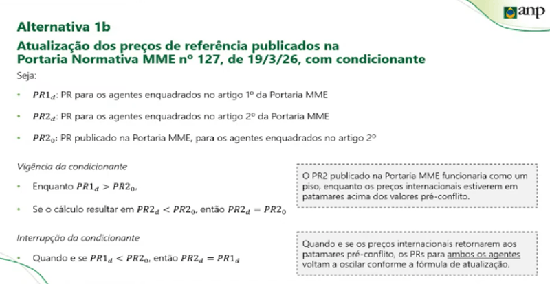 Por três votos a dois, a proposta aprovada foi a alternativa 1b, que diz sobre a atualização dos preços de referência publicados na Portaria Normativa MME nº 127/2026, com condicionante, conforme os cálculos reproduzidos abaixo:
