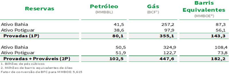 Considerando a nova certificação de reservas, a PetroReconcavo passa a deter 182,2 milhões de barris de óleo equivalente de reservas provadas mais prováveis (2P), dos quais 143,3 milhões de barris correspondem às reservas provadas (1P) e 61,4 milhões de barris são classificadas como reservas provadas desenvolvidas em produção (PDP).